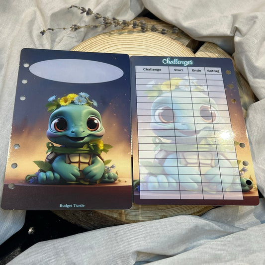 Deckblatt mit Challengeübersicht // Turtle Dashboards // A6 Budgetplaner Tracker // gelocht & foliert